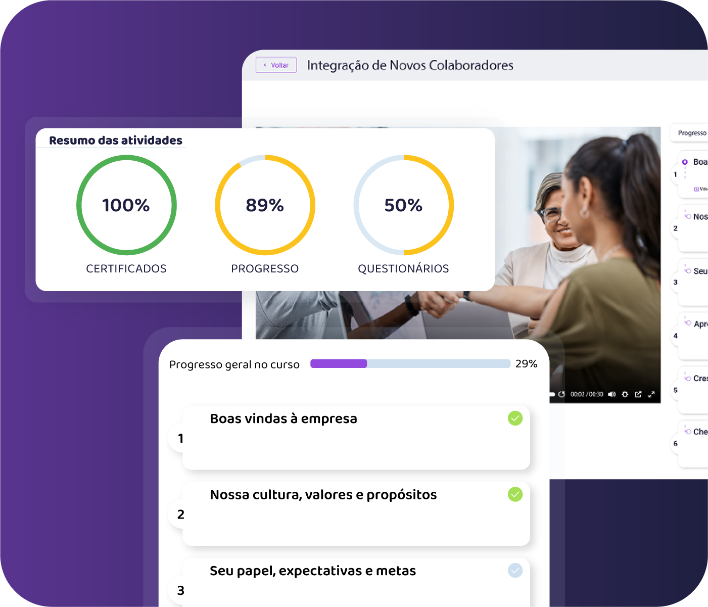 - Suporte em português com equipe especializada em educação corporativa, disponível para acompanhar desde a configuração inicial até a operação no dia a dia.
